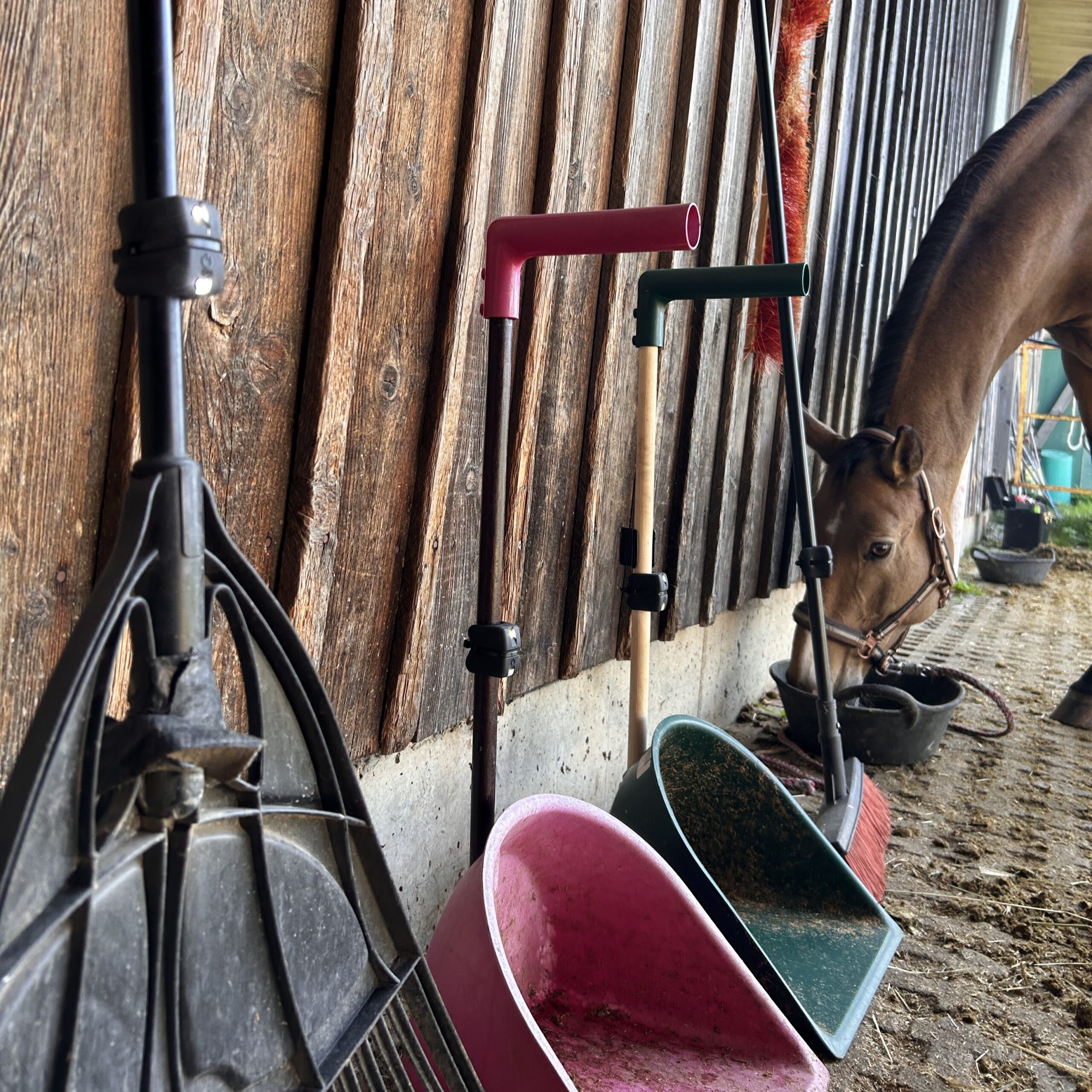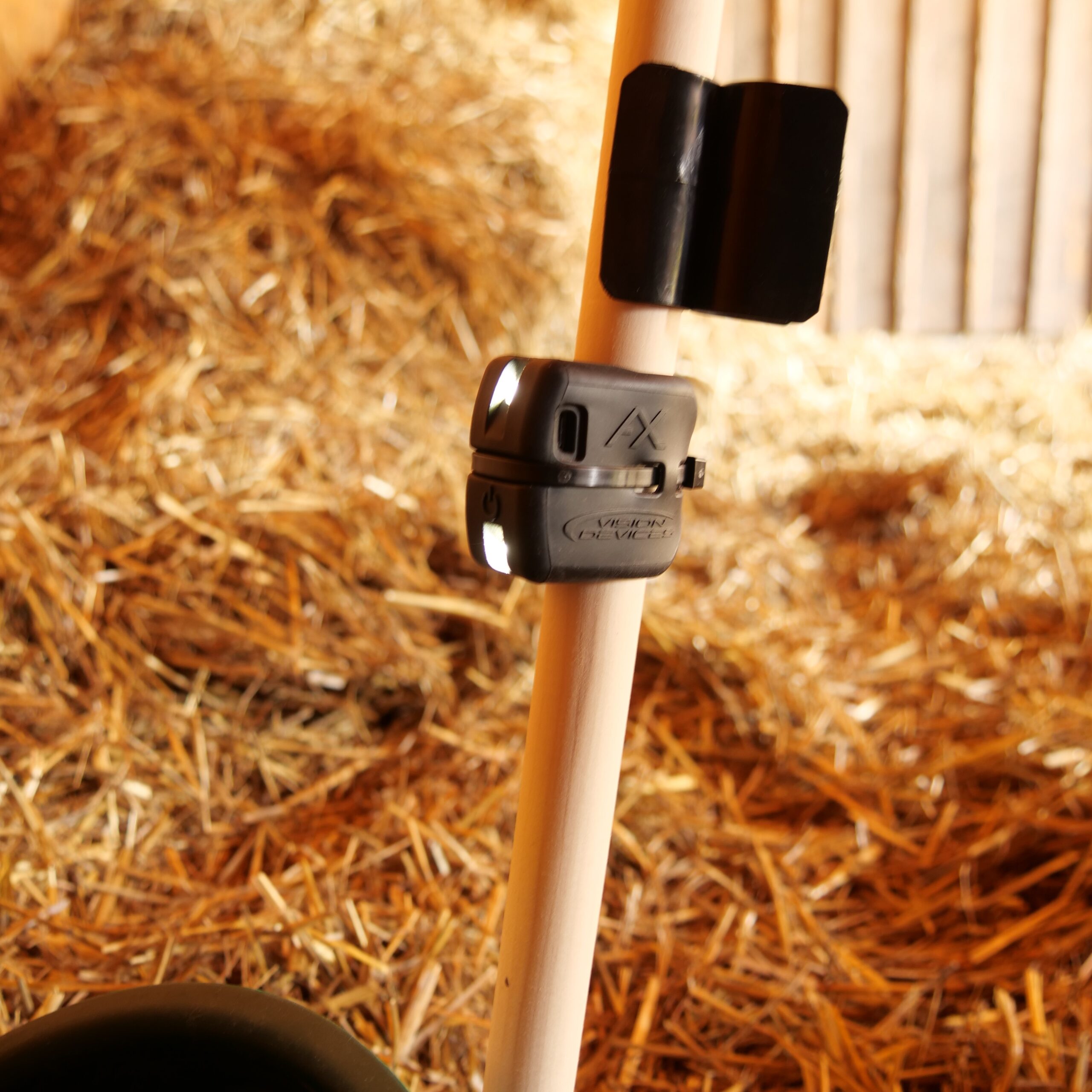 AXL ist eine robuste LED-Beleuchtung zur gezielten Ausleuchtung des Arbeitsbereichs von Stall- und Hofwerkzeugen mit Stiel, wie Bollensammler, Rechen, Besen oder Forken.